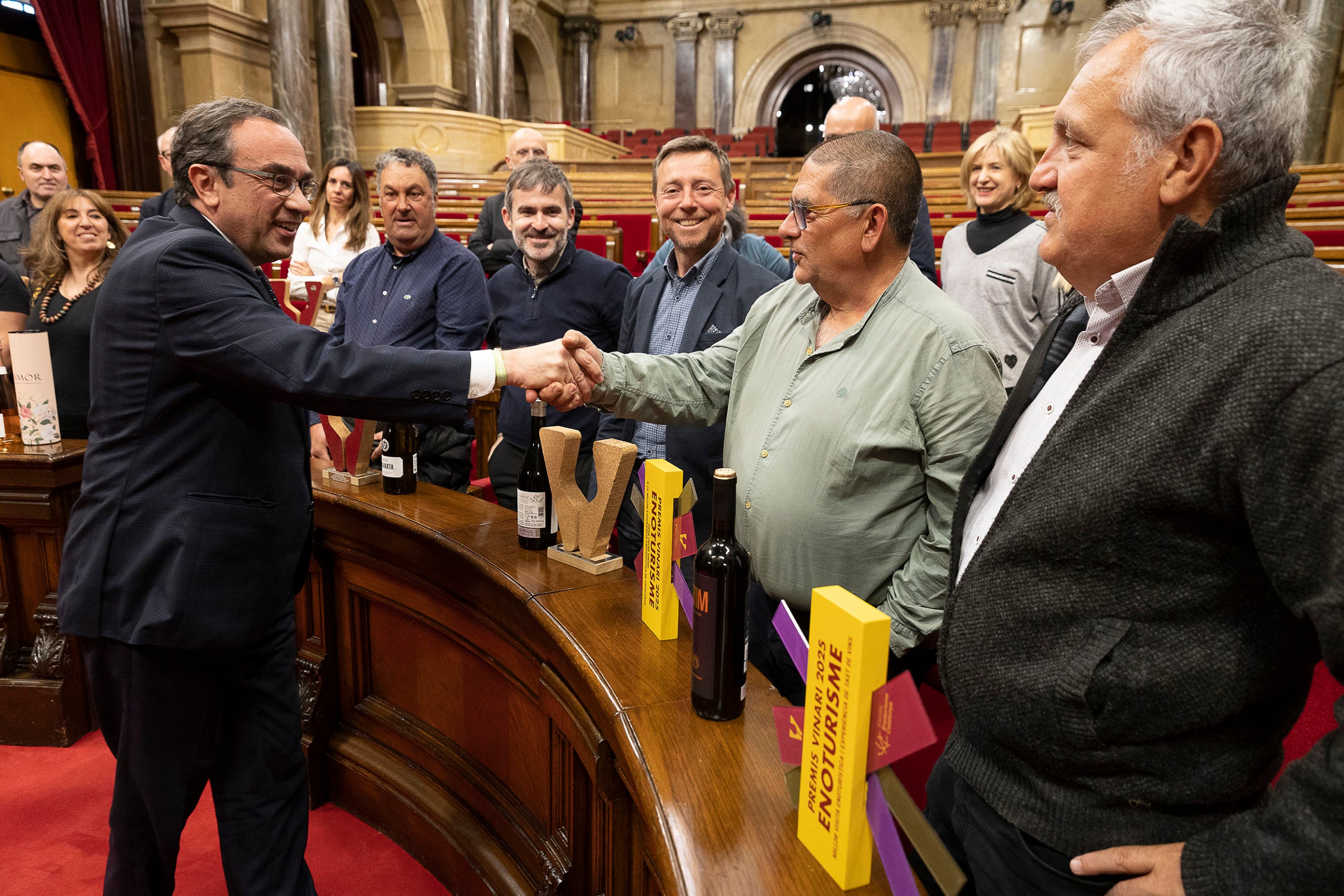 “Els Premis Vinari representen la identitat, l’orgull i la determinació de Catalunya”, ha dit el president del Parlament. El primer espai on s’ha reunit Rull amb els guanyadors de l’última edició del concurs ha estat l’hemicicle, molt conegut través de la pantalla però que pocs havien tingut el privilegi de veure en persona. Amb les taules plenes de guardons i ampolles de vi català, Rull ha explicat la història del Parlament, com el pas del temps l’ha fet passar de polvorí a intent de Palau Reial, fins a arribar a ser la seu de les decisions institucionals més importants de la nació. El president ha assegurat que gràcies a la feina dels cellers catalans, la qualitat dels vins del país “arriba a tot arreu”. Així i tot, ha fet èmfasi en la necessitat de continuar apostant pel mercat interior, que en molts moments queda desatès. ”Massa vegades passa que en les cartes dels restaurants no hi predomina el vi català”, ha observat. És per això que els ha demanat continuar cuidant la terra catalana i ha recordat que “els millors vins d’aquest país es fan ara i es fan aquí”, tot afirmant que “la qualitat és un factor determinant”.