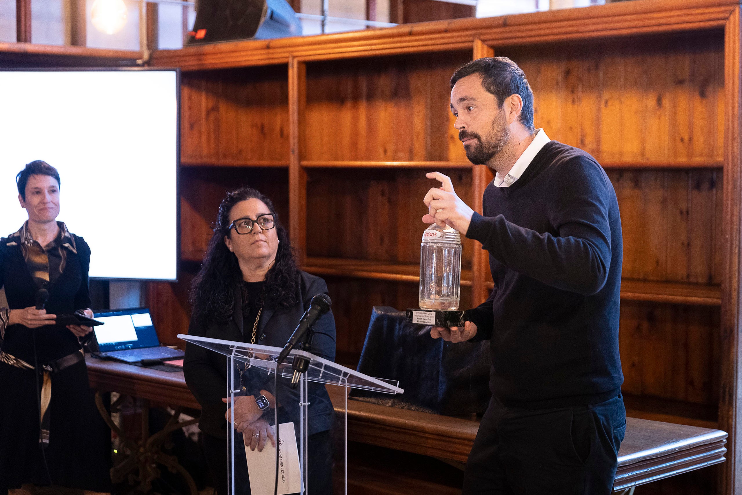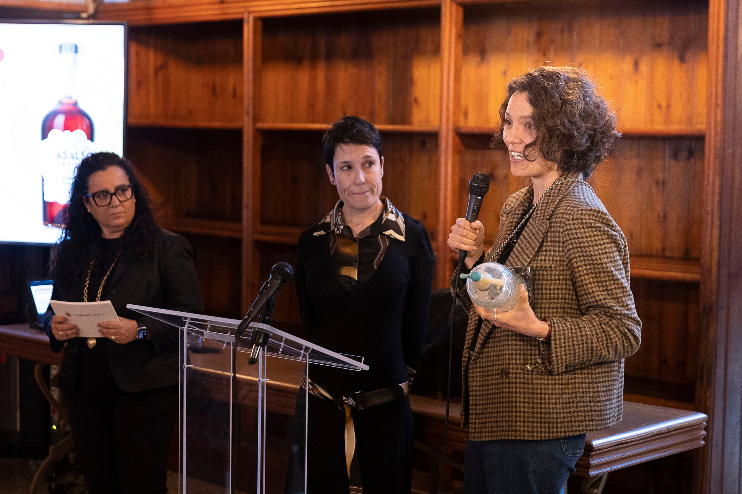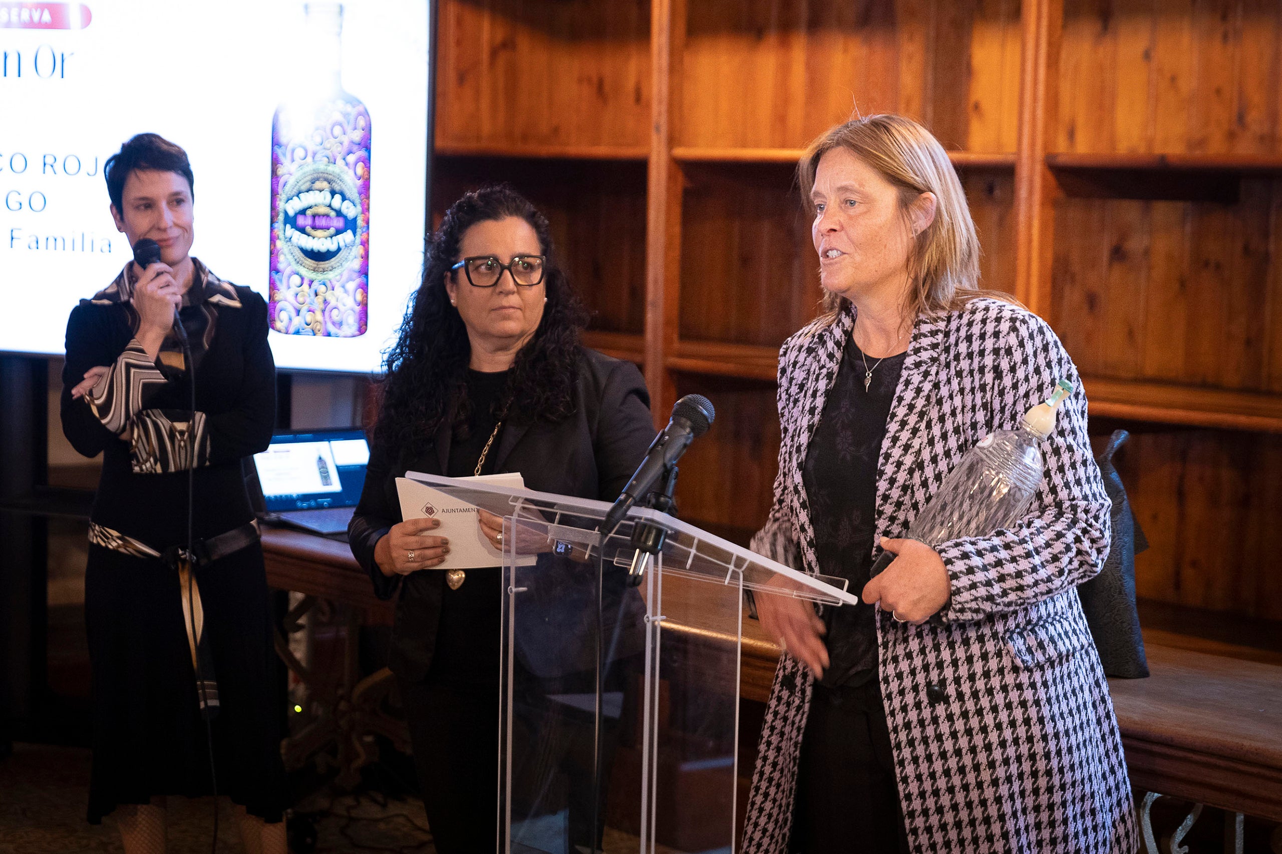 Montse Bové, de Padró & Co i la regidora de Projecció de Ciutat a Reus, Noemí Llauradó en l'acte de lliurament dels Premis Vinari dels Millors Vermuts Catalans.