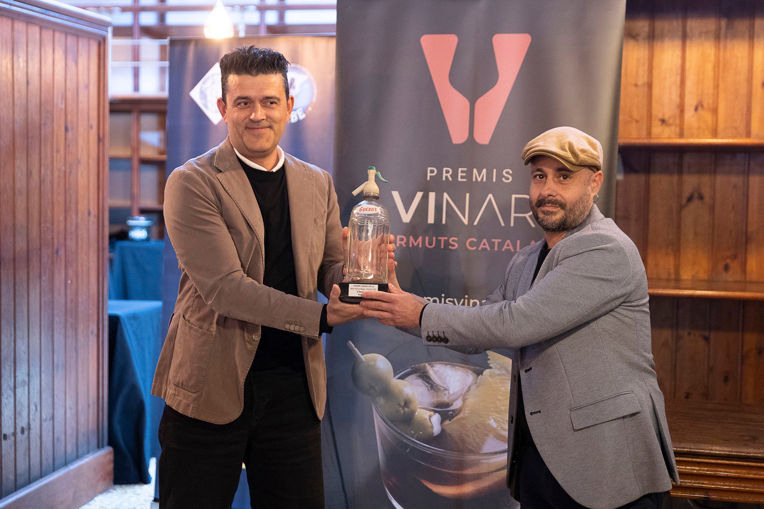 Josep Almirall, del celler Domenio amb Josep Varies, director de Gràfiques Varias durant l'acte de lliurament dels Premis Vinari dels Millors Vermuts Catalans.