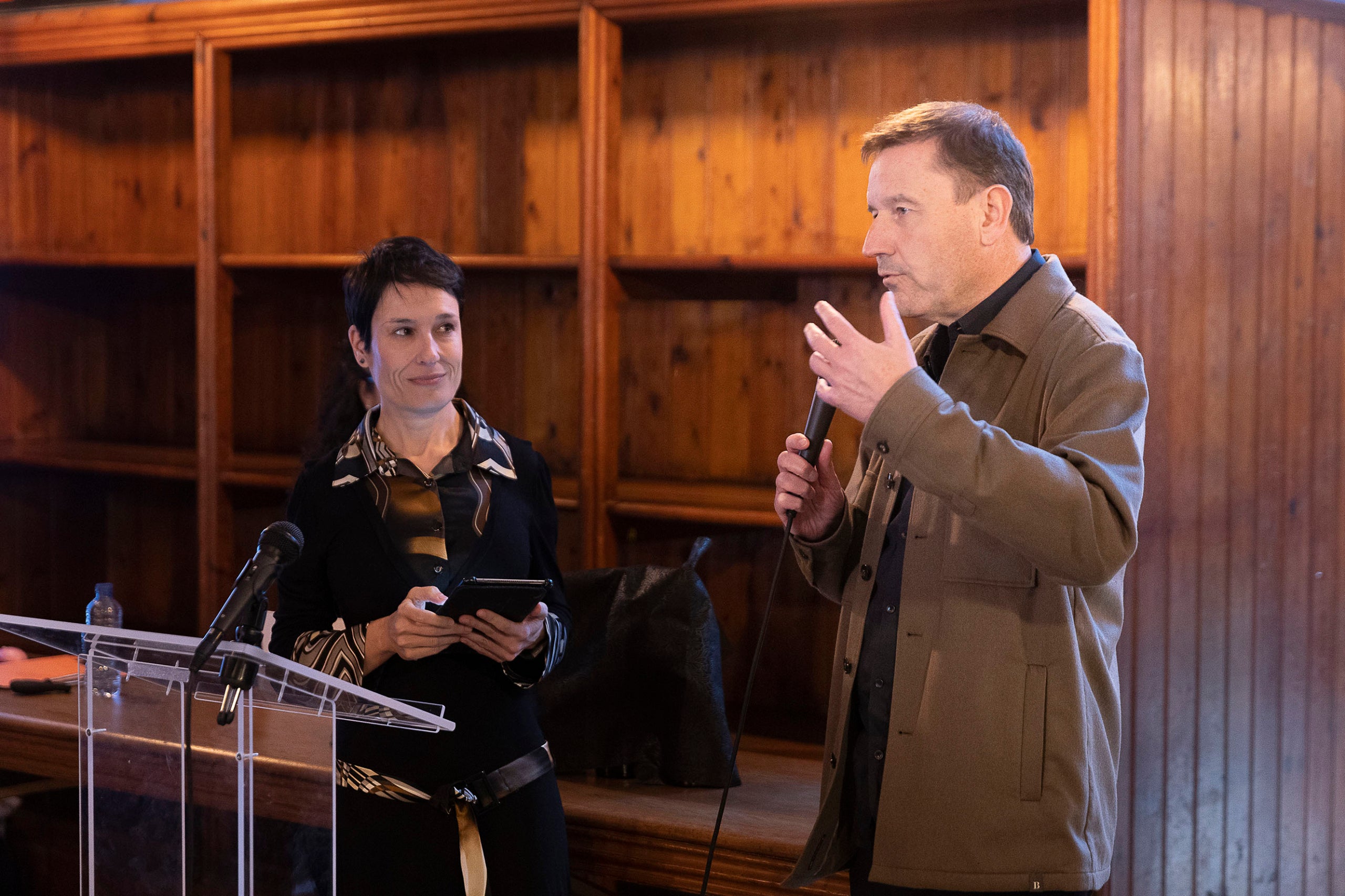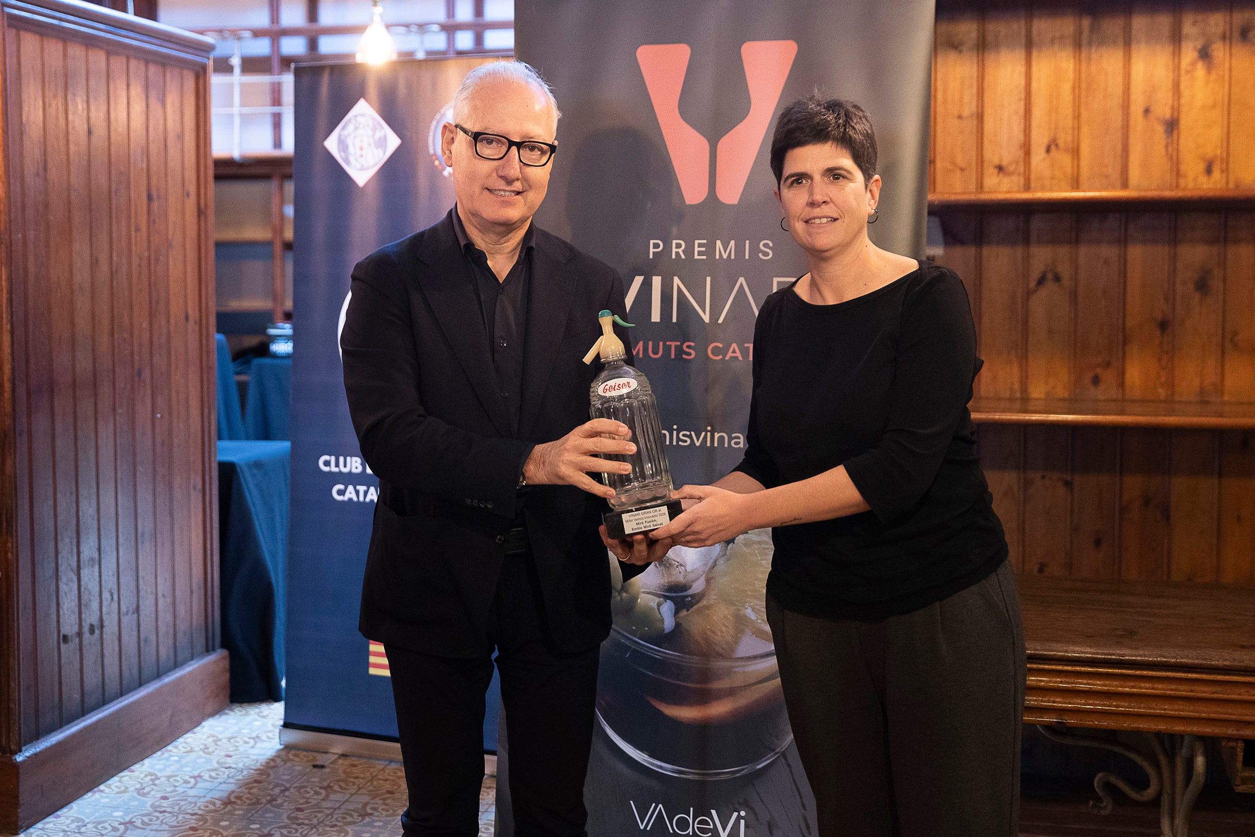 Alex Illa, director del celler Priorat B&D Lab i Mariona Vilanova, presidenta del Club de Bartenders de Catalunya durant l'acte de lliurament dels Premis Vinari dels Millors Vermuts Catalans.