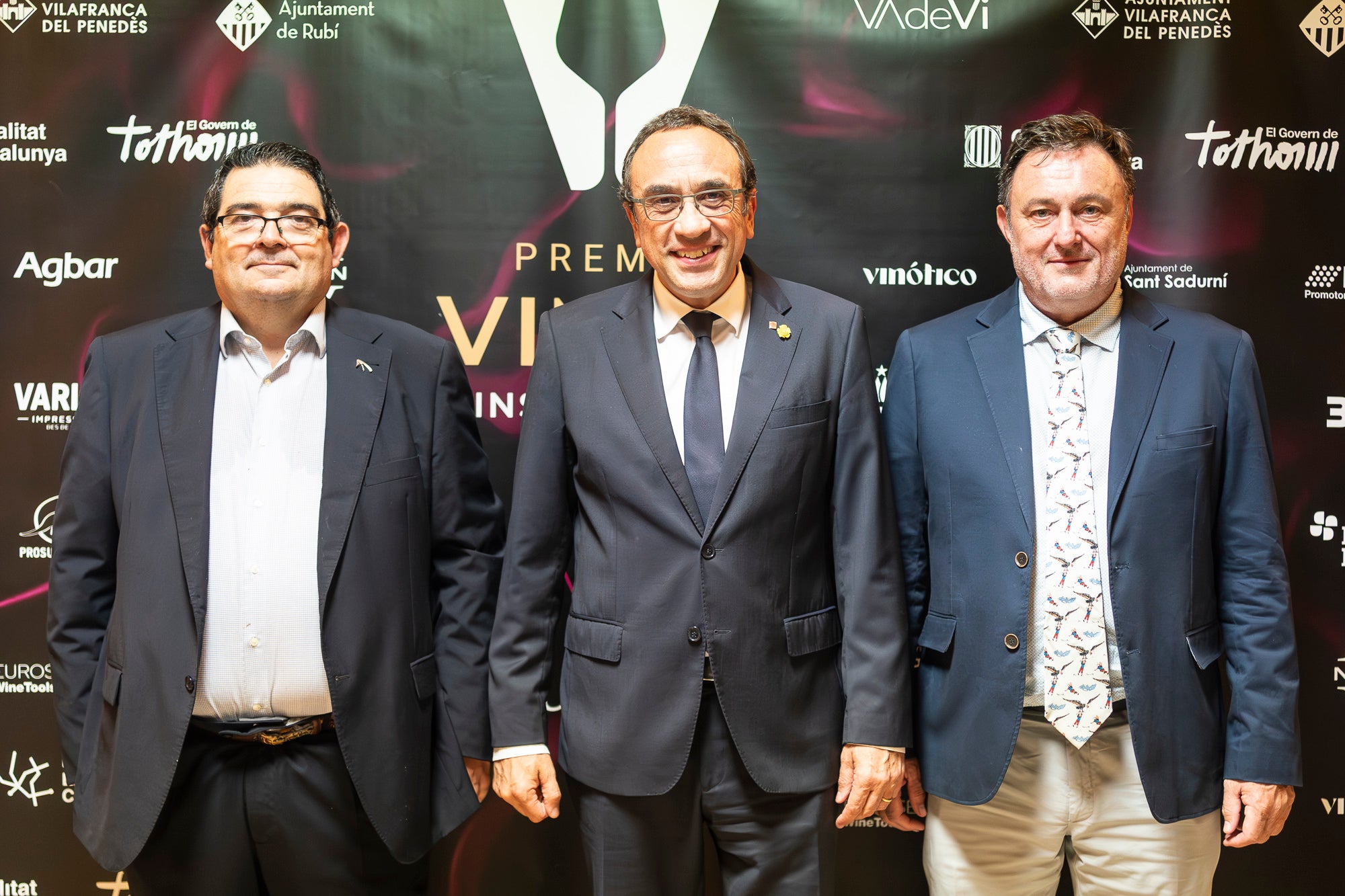 Josep Rull, president del Parlament de Catalunya, Francisco Romero, alcalde de Vilafranca del Penedès i el celler Família Torres rebent el guardó de Millor Vi dels Premis Vinari 2025 / Mireia Comas
