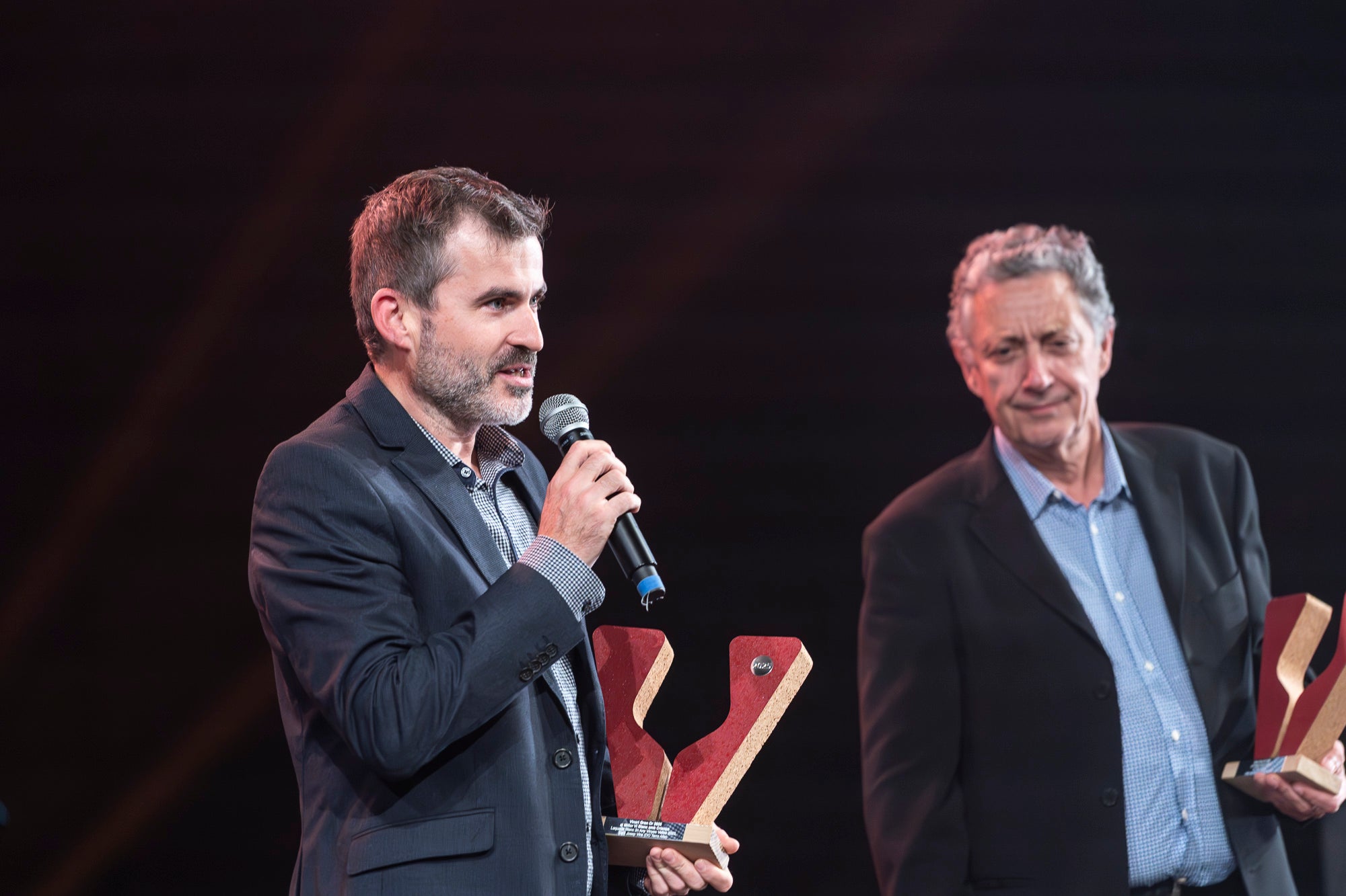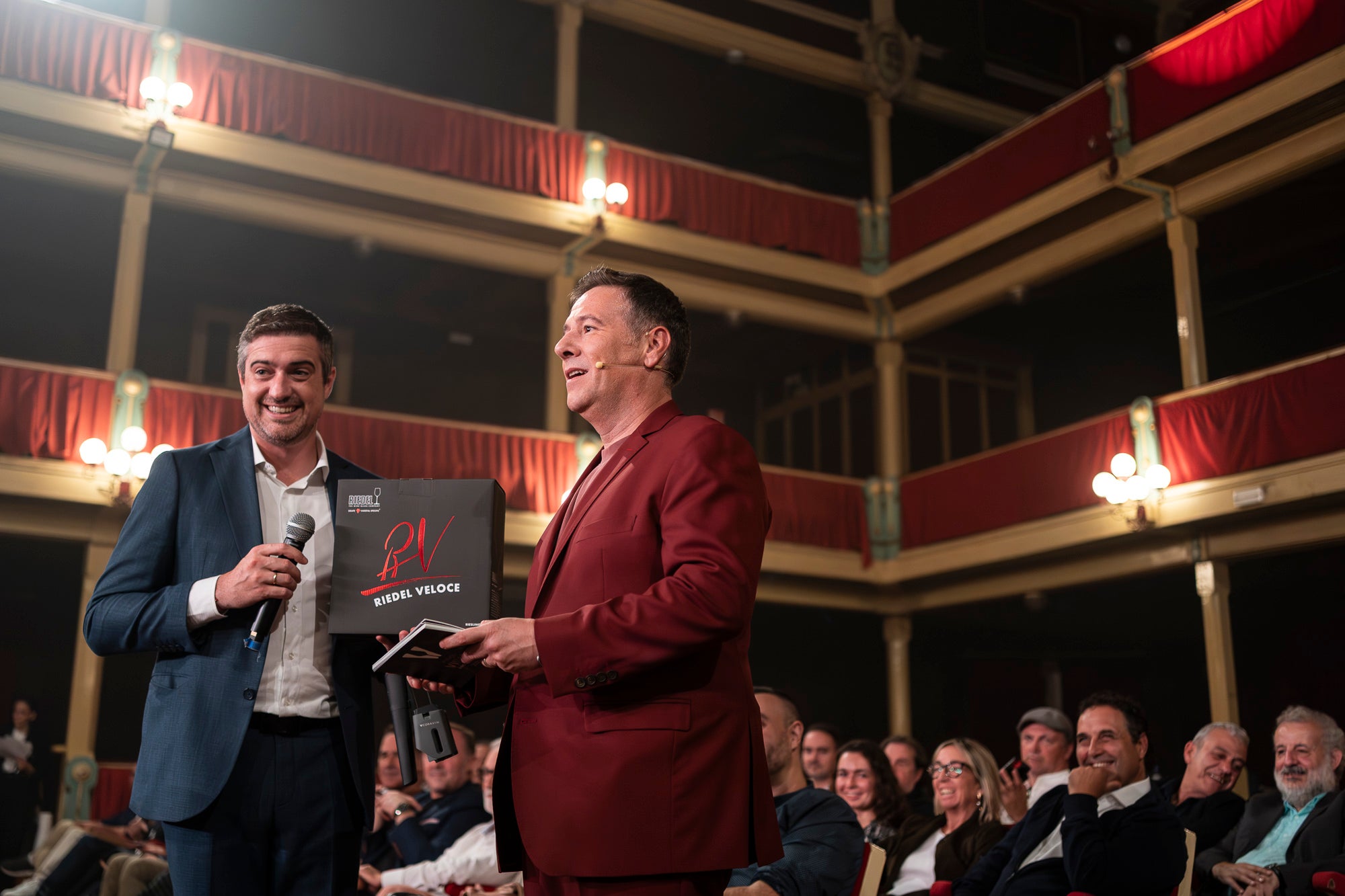 Pla detall de Carlos Latre, presentador de la gala i Bruno Xavier, d’Euroselecció-Riedel als Premis Vinari 2025 / Mireia Comas