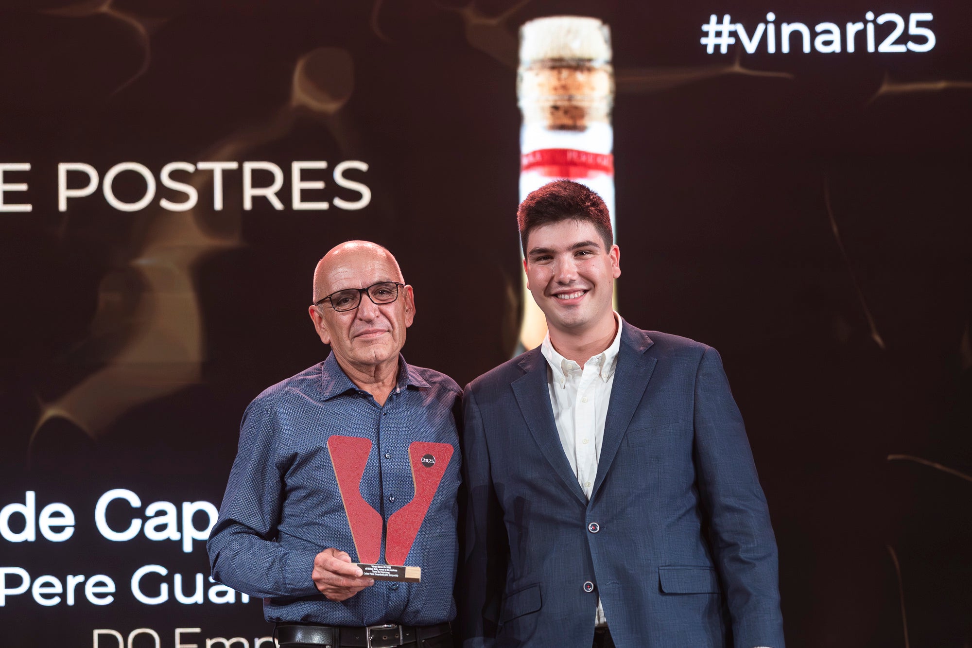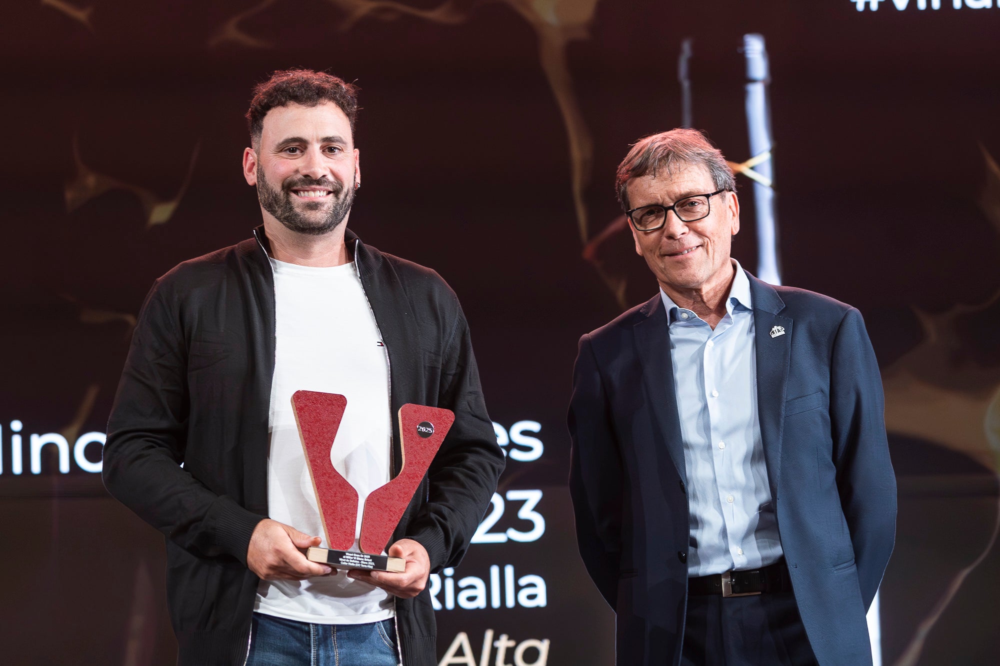 Vinari Gran Or al Millor Vi Negre amb Criança, Els Pájaros 2022, Celler de Capçanes (Do Montsant) i Jordi Rosat, director general de Petrolis Independents, durant la gala dels Premis Vinari 2025 / Mireia Comas
