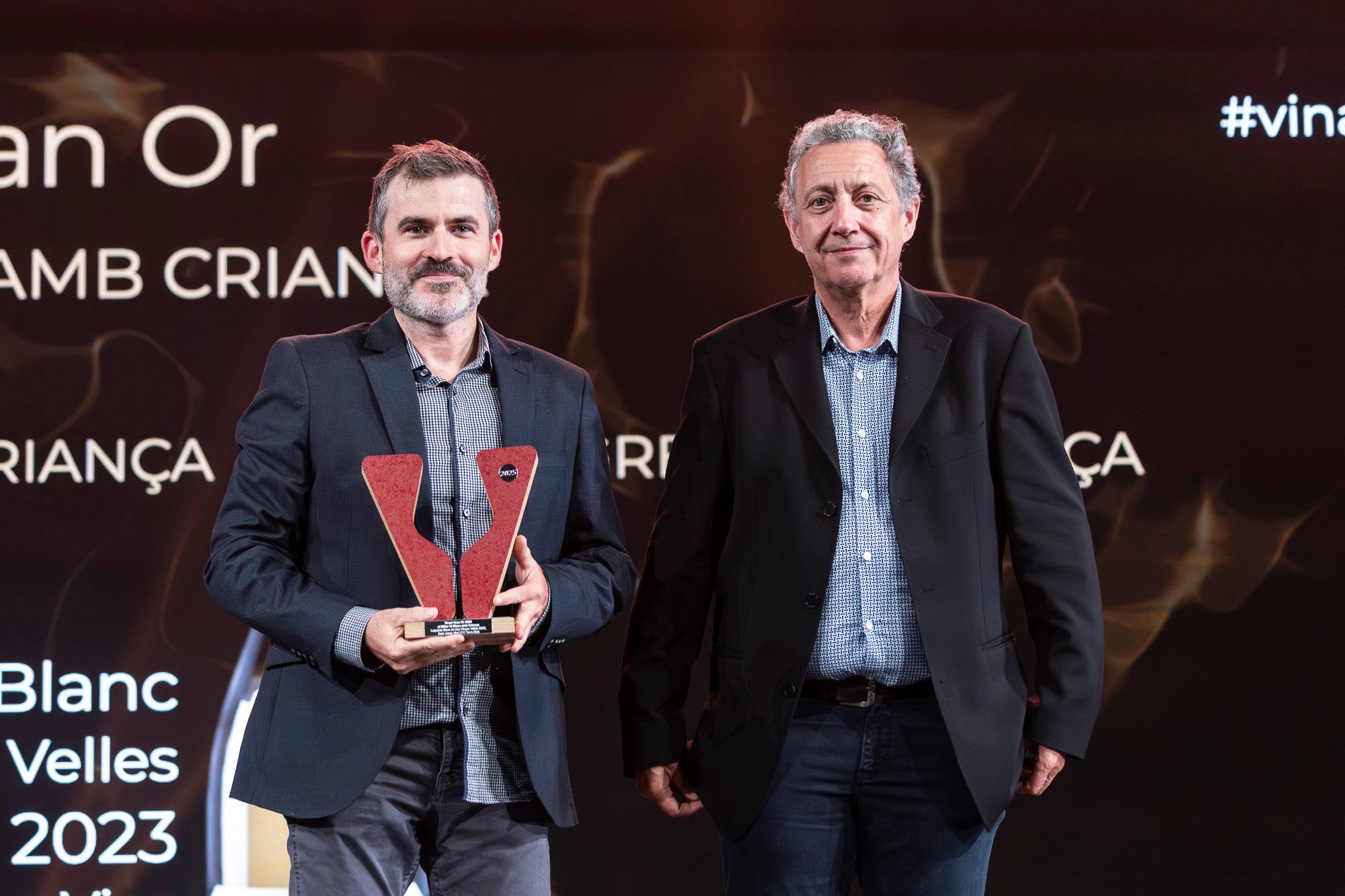 Vinari Gran Or al Millor Vi Blanc amb Criança, Laquarta Blanc 2n Any Vinyes Velles 2023, Sant Josep Vins (DO Terra Alta) i Jordi Roset, director general de Petrolis Independents durant la gala dels Premis Vinari 2025 / Mireia Comas