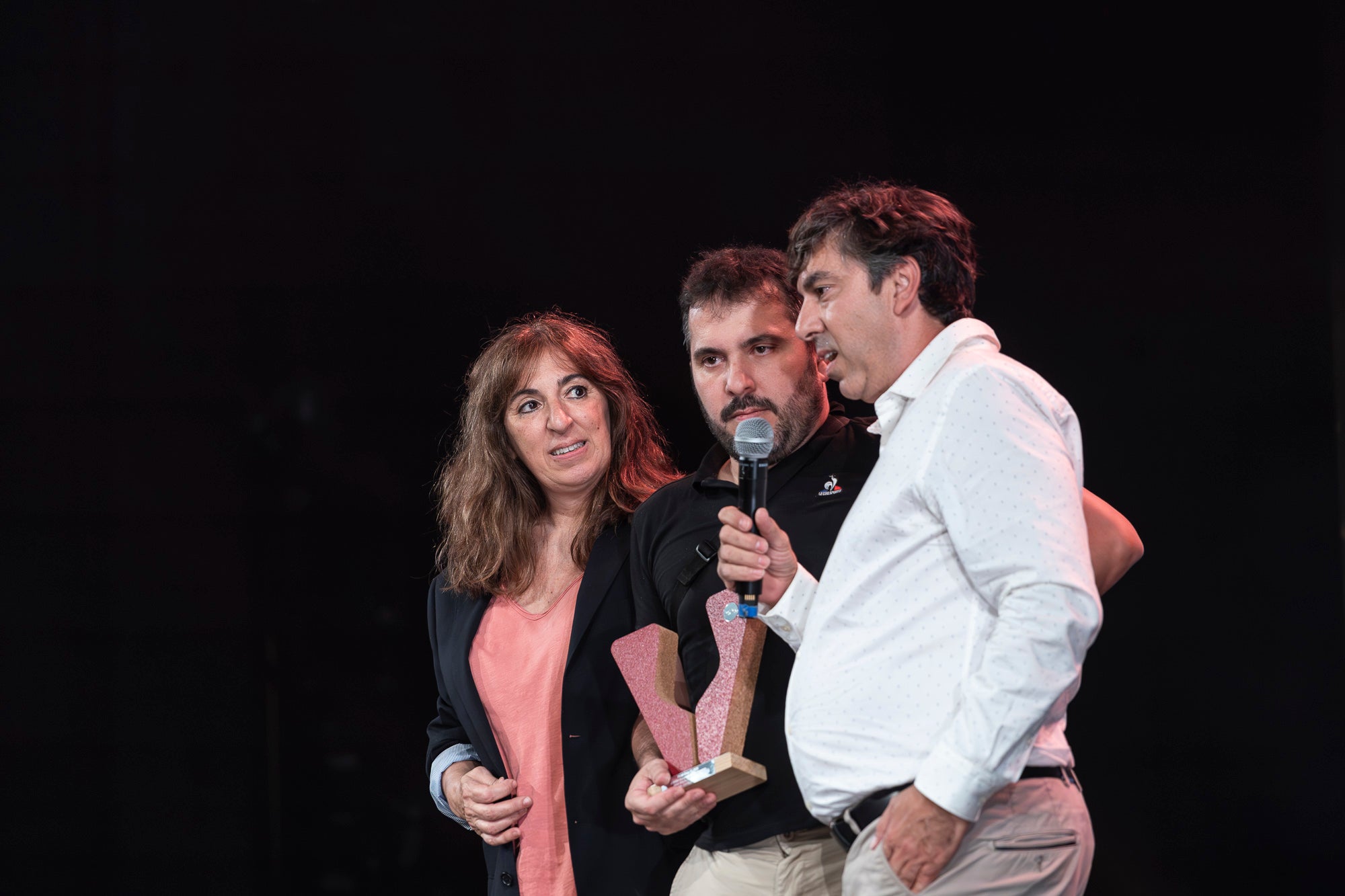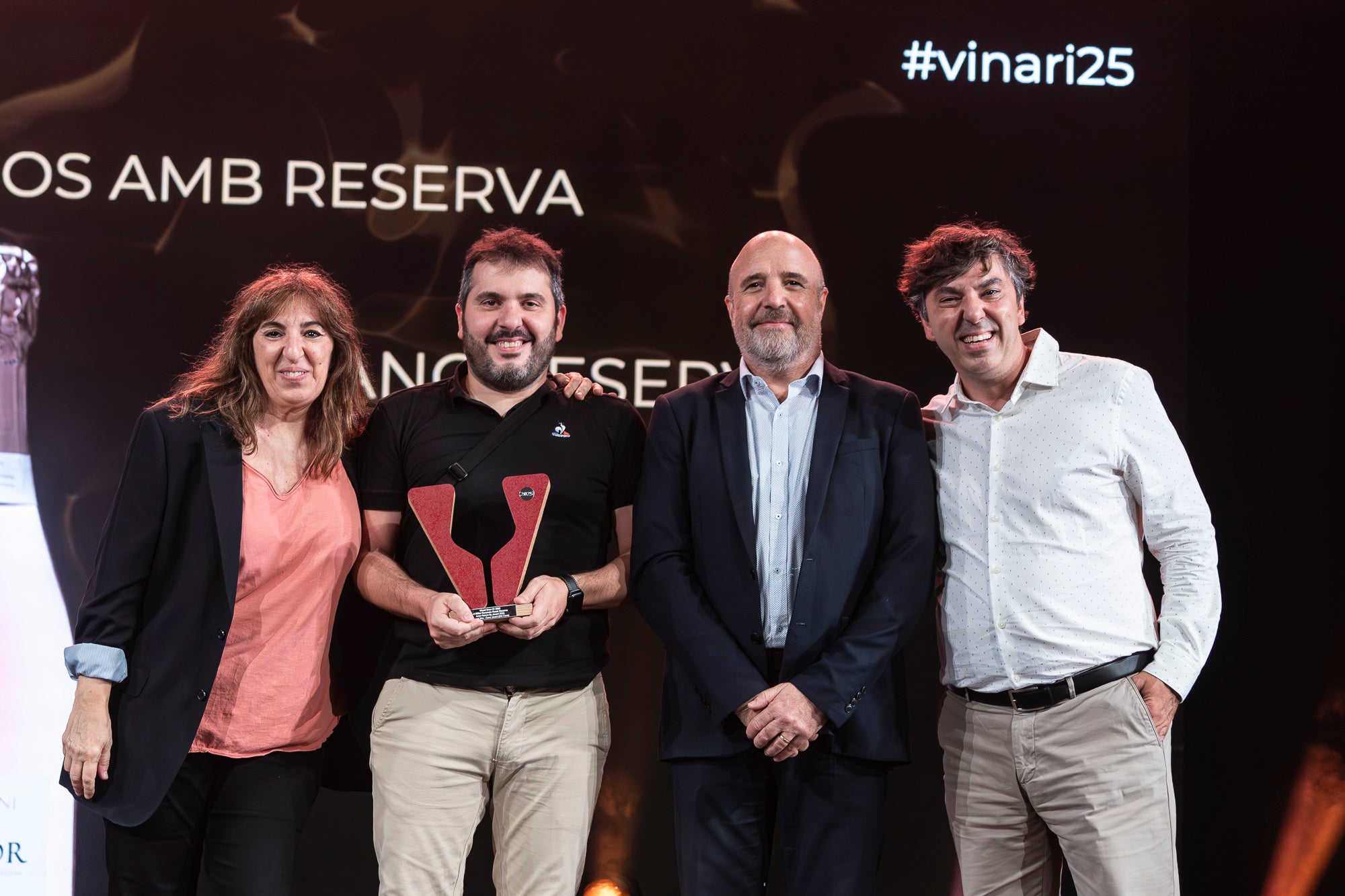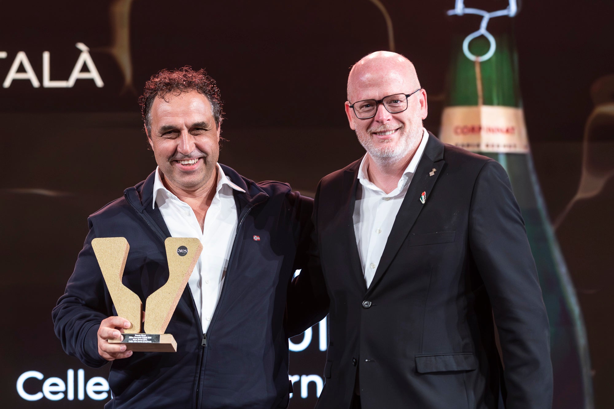 Vinari Gran Or al Millor Brisat, Ninot de Bellotes – Blanc 2023, Celler Rialla (DO Terra Alta) i el director de Prosuber 2000, Jaume Tauler, durant la gala dels Premis Vinari 2025 / Mireia Comas